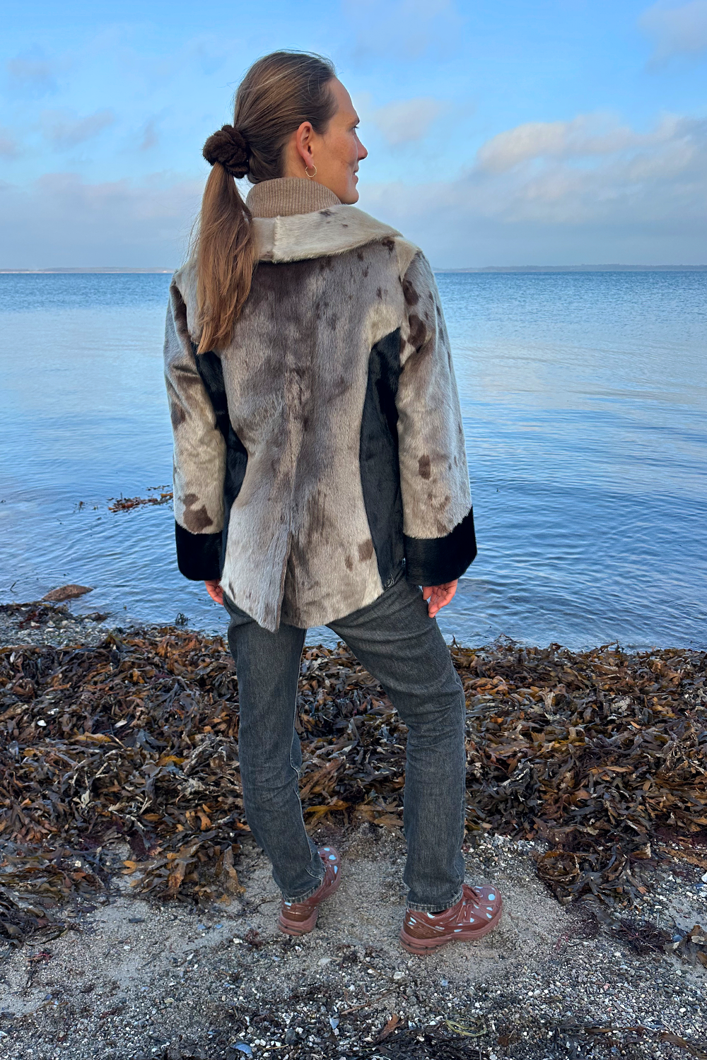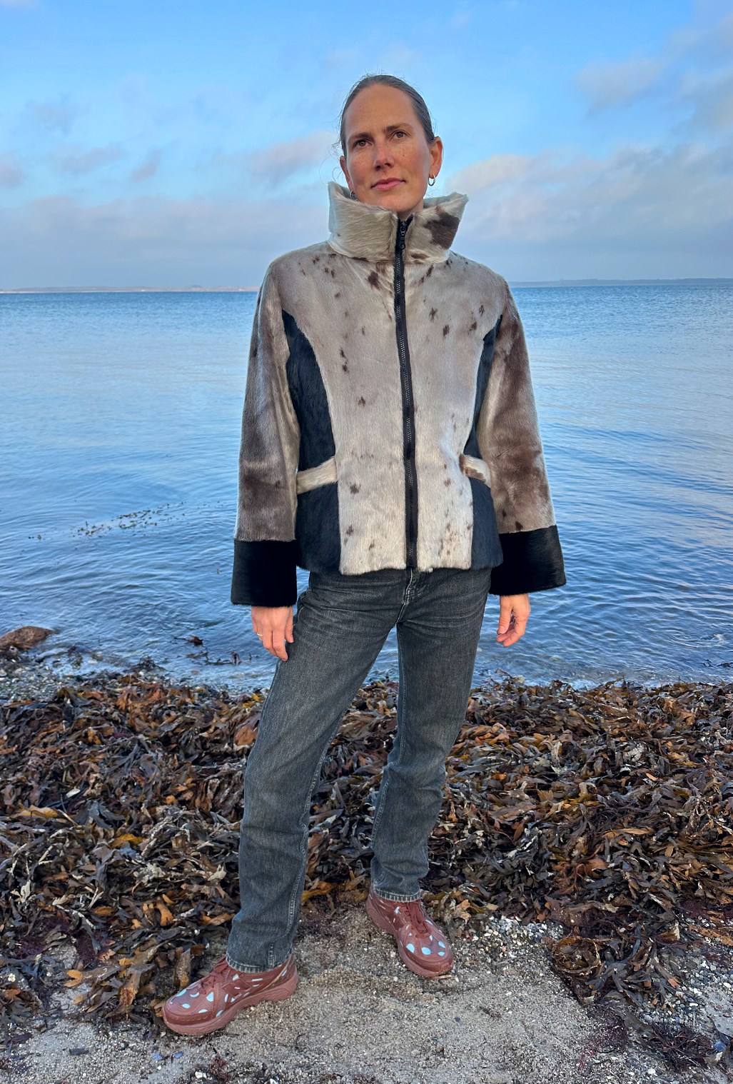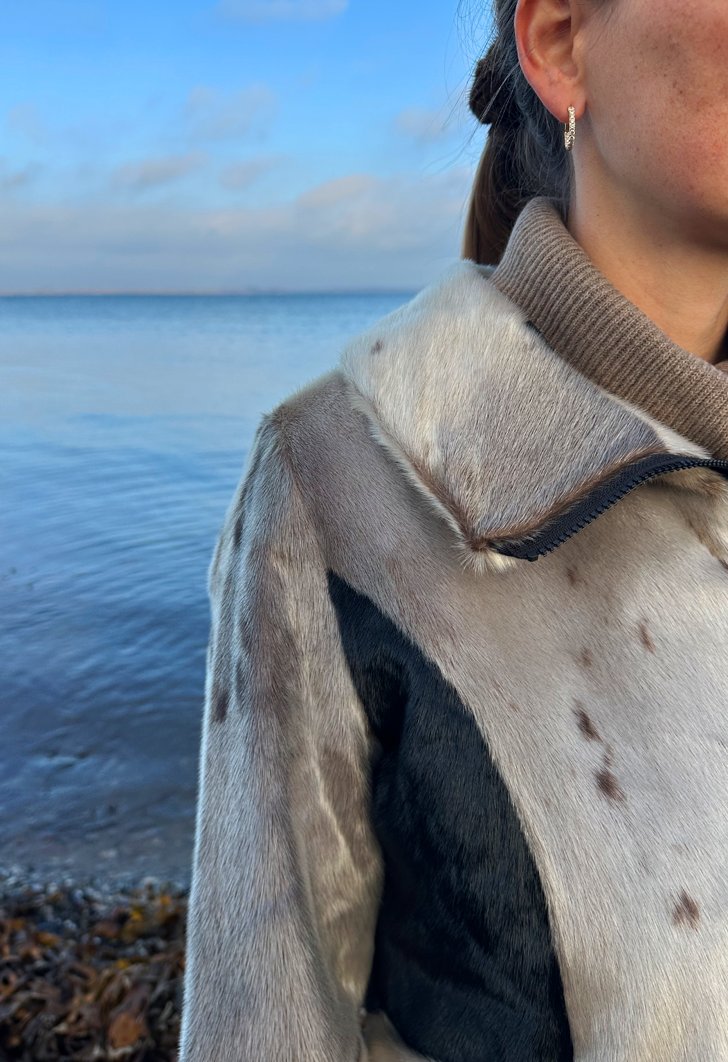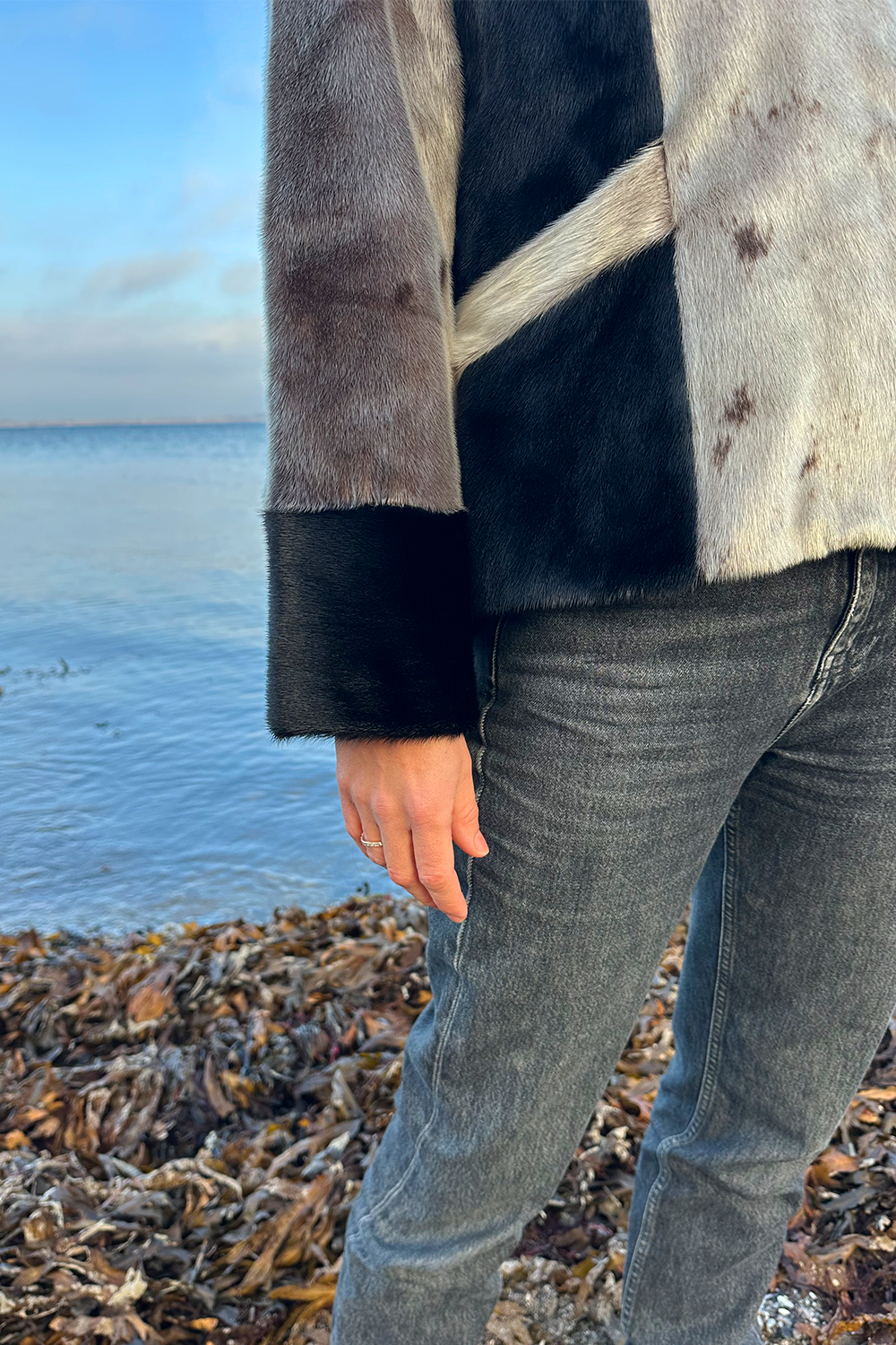 Designet er både moderne og figurskabende. De elegante, sorte paneler i siderne og de brede sorte manchetter skaber en flot kontrast til det naturlige gråspættet sælskind og giver en visuelt slankende effekt, der fremhæver taljen. Jakken er udstyret med en høj, stående krave, der både ser sofistikeret ud og beskytter mod vinden, samt en praktisk lynlås, der giver frakken et sporty og nutidigt udtryk. Den er perfekt til både jeans og mere formelle outfits.
