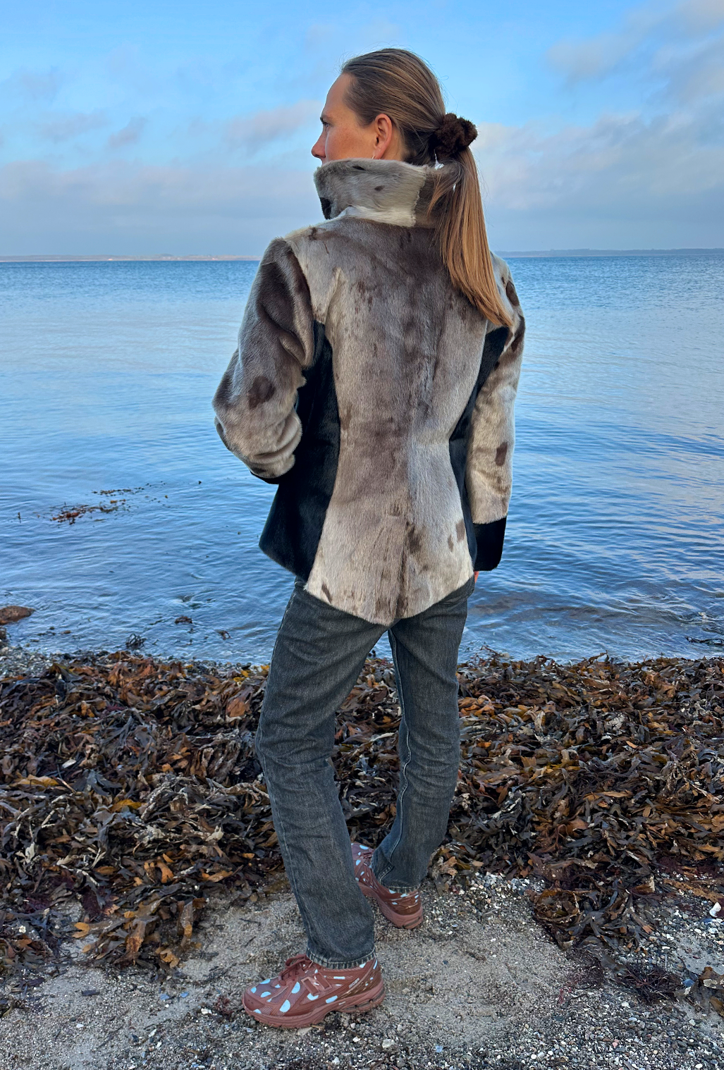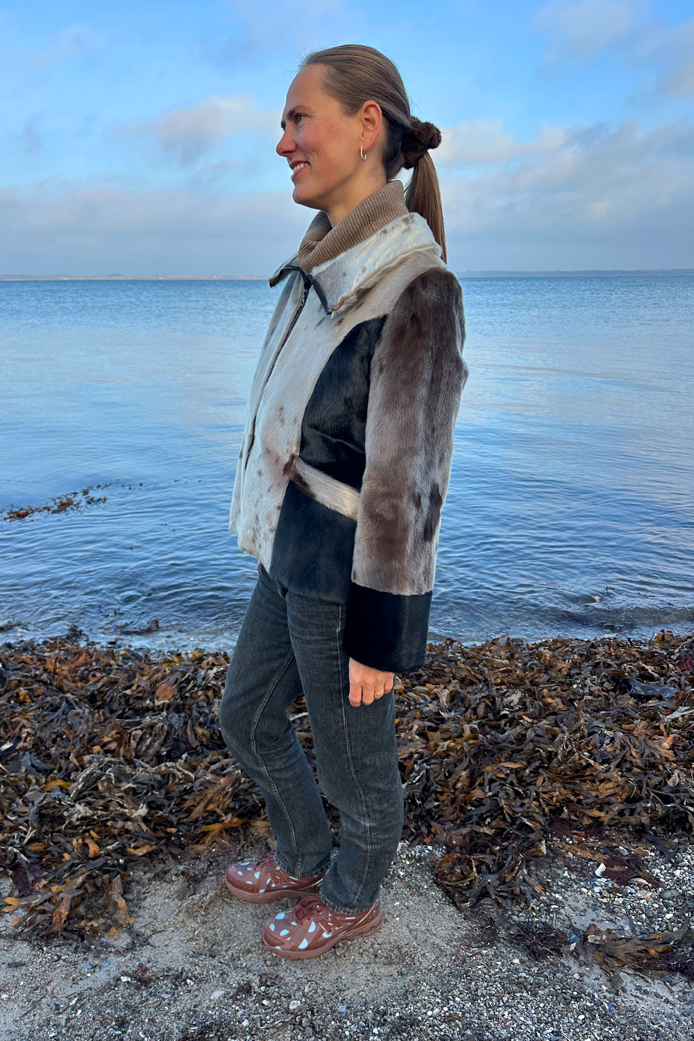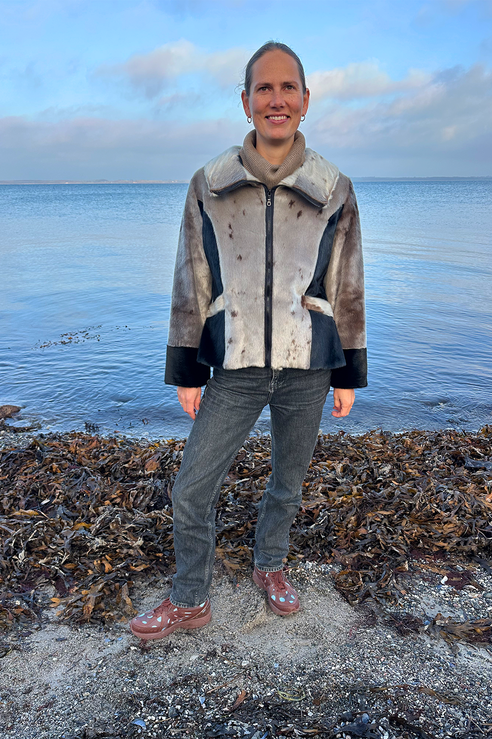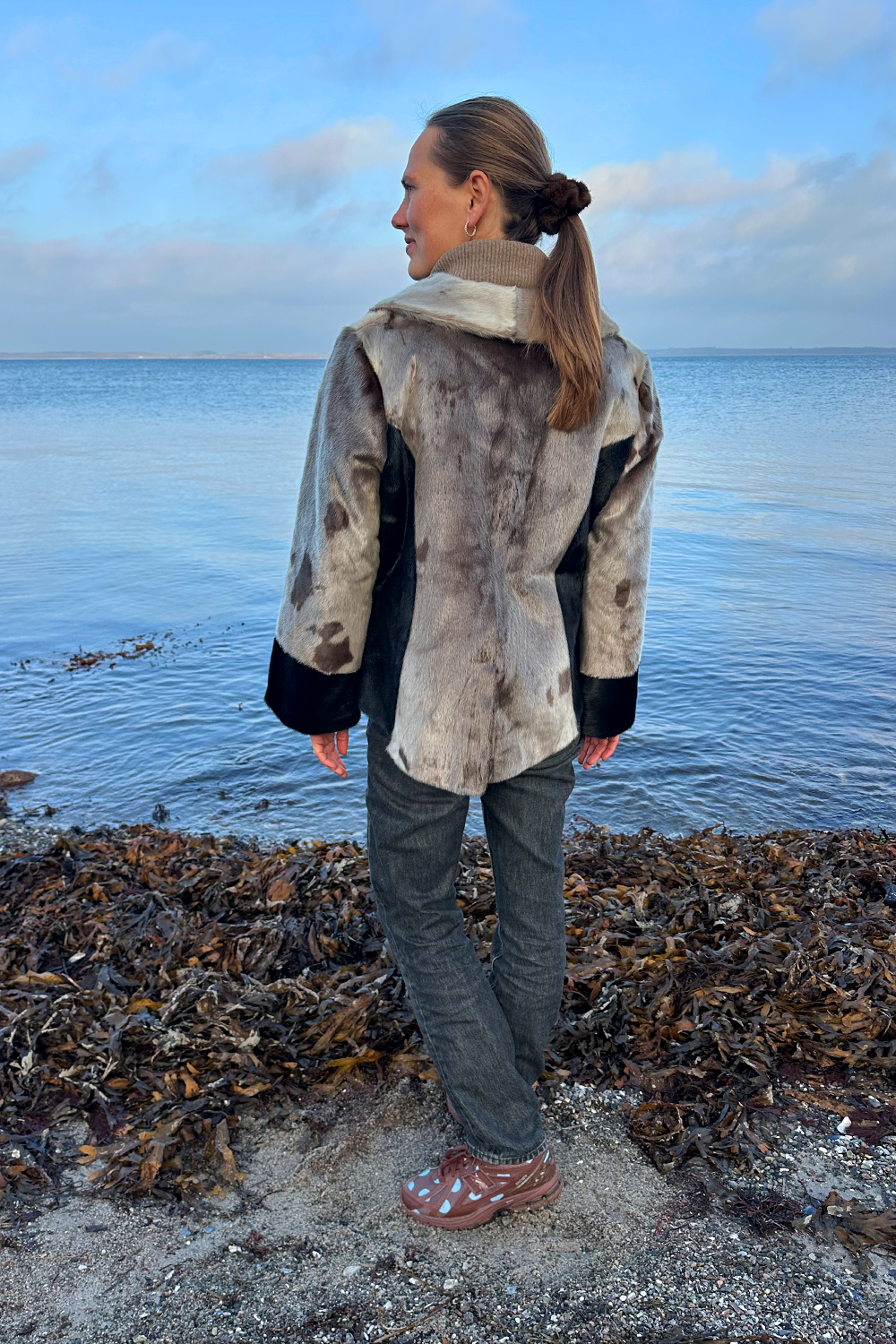 Designet er både moderne og figurskabende. De elegante, sorte paneler i siderne og de brede sorte manchetter skaber en flot kontrast til det naturlige gråspættet sælskind og giver en visuelt slankende effekt, der fremhæver taljen. Jakken er udstyret med en høj, stående krave, der både ser sofistikeret ud og beskytter mod vinden, samt en praktisk lynlås, der giver frakken et sporty og nutidigt udtryk. Den er perfekt til både jeans og mere formelle outfits.